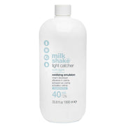 milk_shake light catcher soft light oxidizing emulsion is an oxidizing emulsion formulated to give 4-5 levels of lift to natural bases as well as giving grey coverage when combined with lift & balance; gives lift to natural or color-treated hair when combined with light layers.